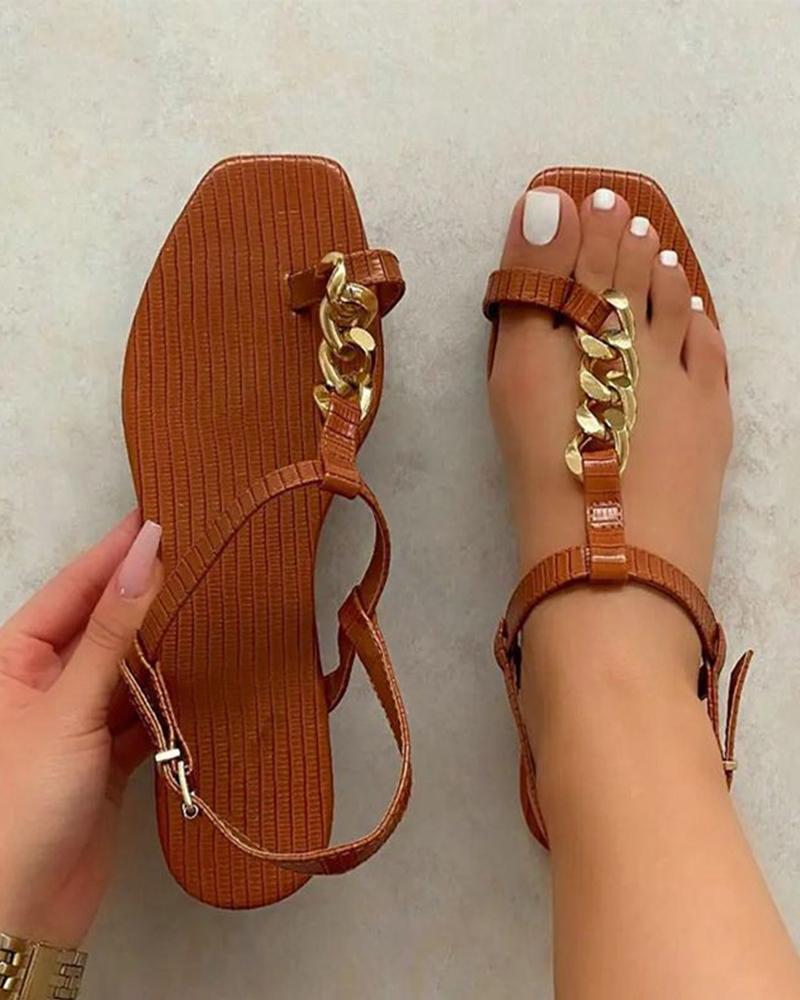 Square-toe Solid Color Splicing Chain Toe Post Flat Sandals, Brown
