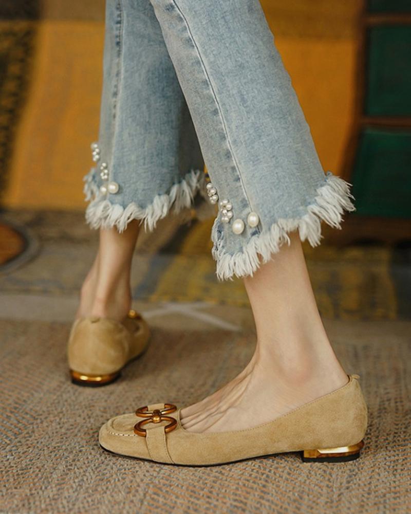 Square-toe Solid Color Splicing Chain Suede Flat Shoes, Khaki