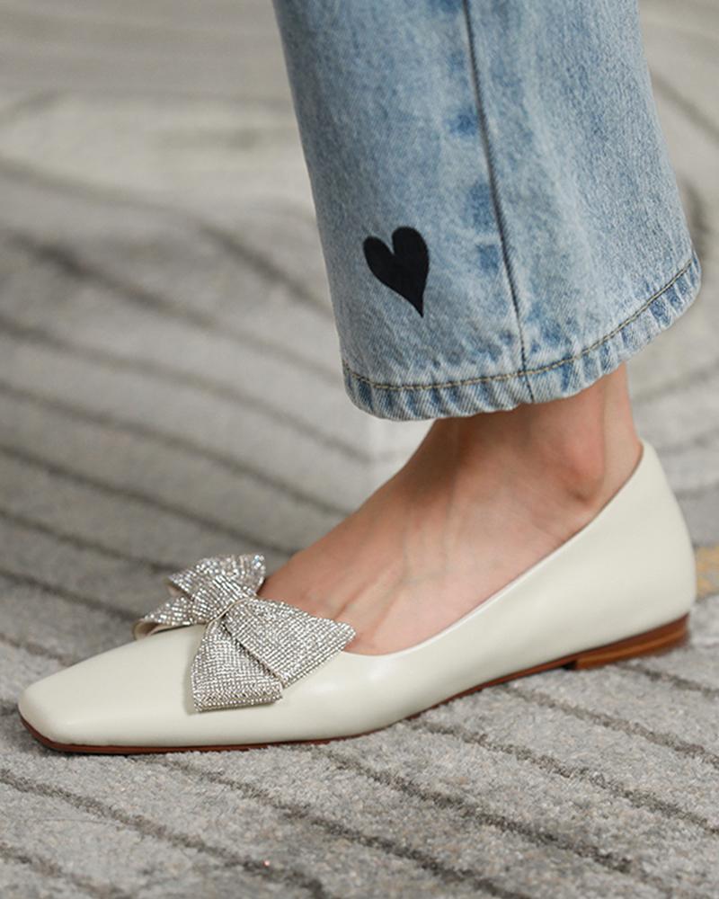 Square-toe Solid Color Splicing Rhinestone Bow Flat Slip-on, White