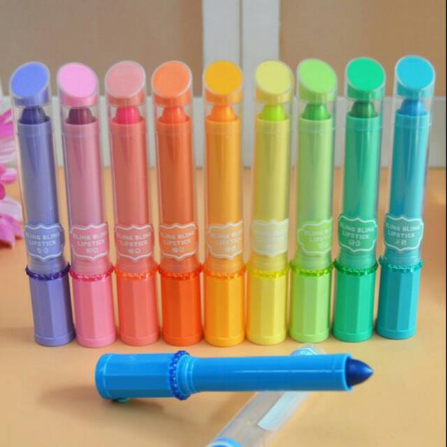 Stabilo Bling Bling berbentuk Lipstik ini modelnya lucu banget, kamu hanya perlu memutar bagian bawah stabio untuk menggunakannya. Warna cerah, desain lucu.