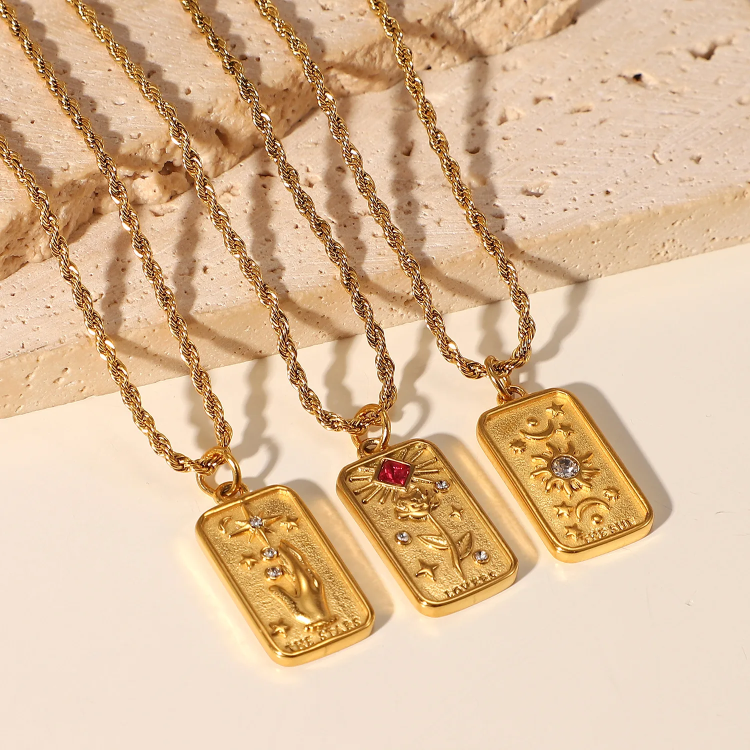 Stainless Steel Square Zircon Pendant Necklaces 18k Gold Plated Twust Rope Chain Sun Star Tarot Pendant Necklace