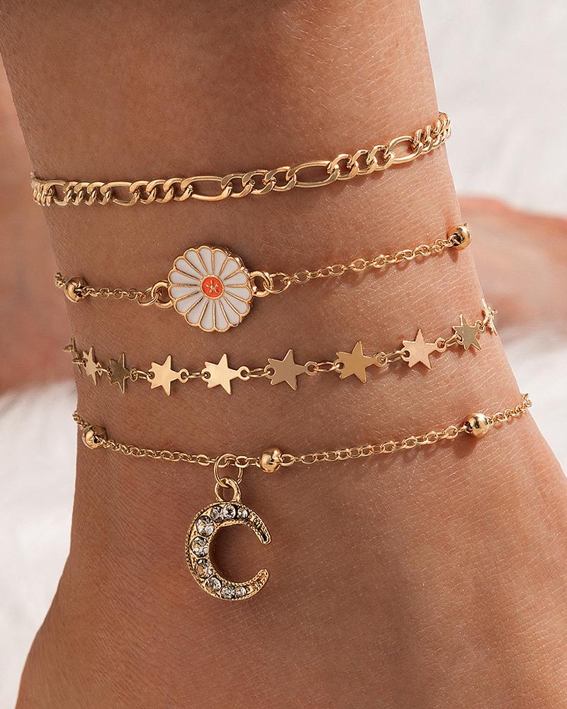 Star & Moon & Daisy Rhinestone Chain Anklet, Gold