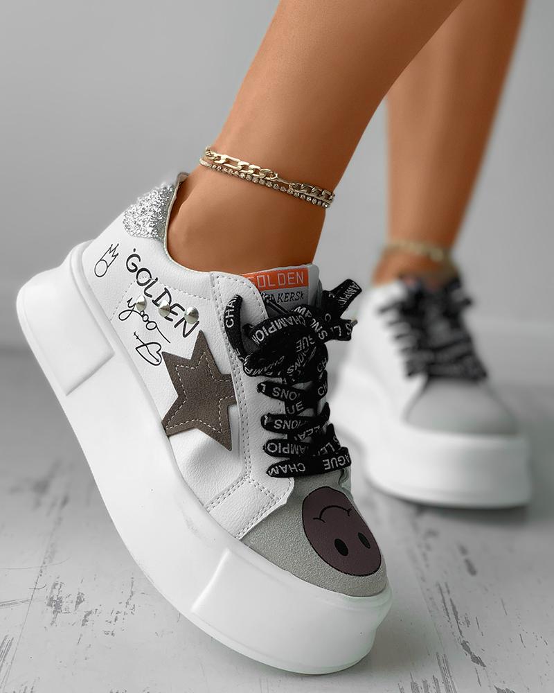 Star Pattern Letter Lace-up Studded Decor Sneaker, Gray