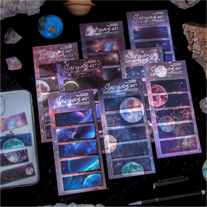 Stargazer Space Label Memo Set adalah koleksi kertas memo (tanpa lem) yang terbuat dari special paper. Bahan kertas agak transparan yang sekilas mirip dengan kertas washi ini memungkinkan gambar foto untuk dicetak di atasnya dengan jelas, menghadirkan pemandangan luar angkasa yang indah di atas halaman bukumu.