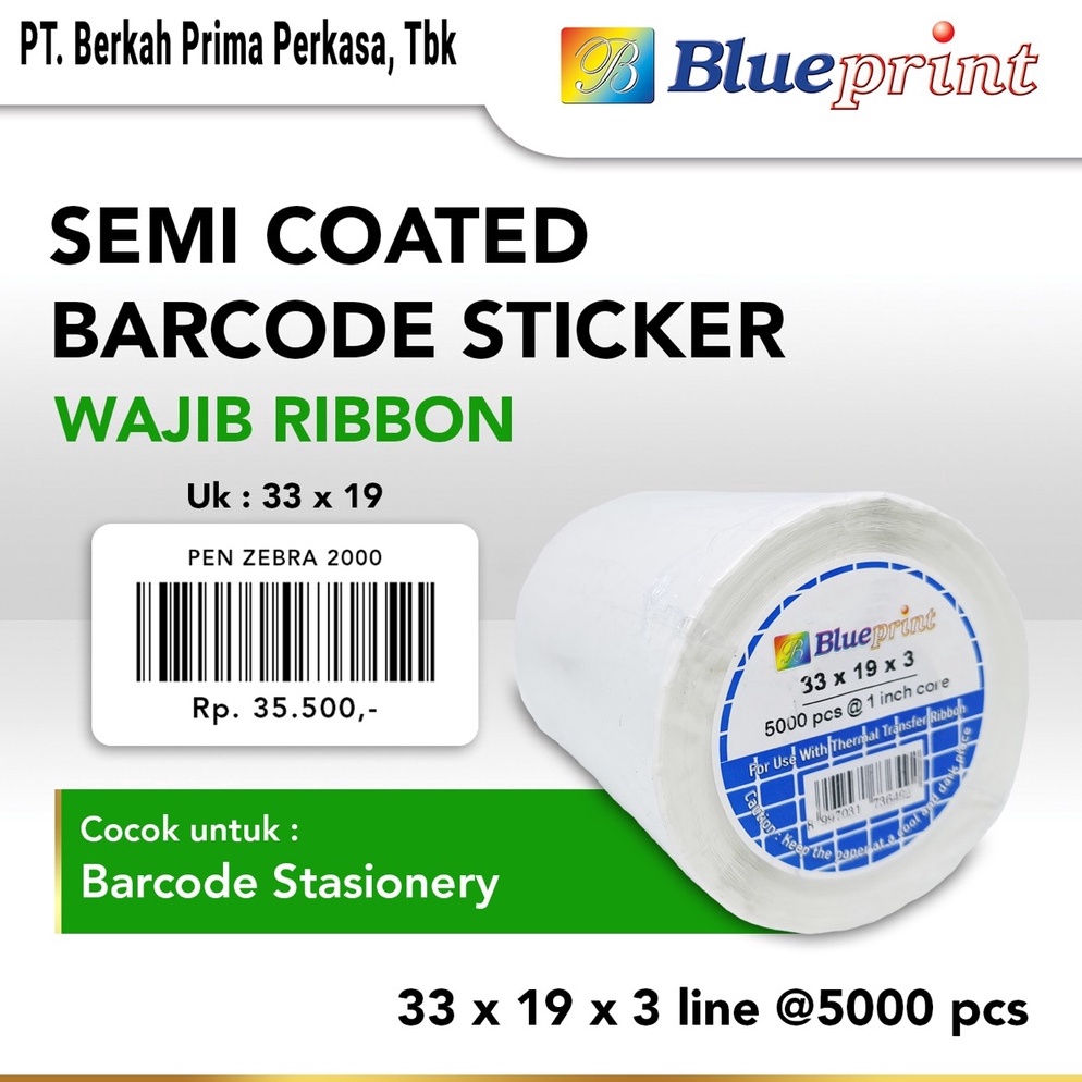 Sticker Barcode 33x19 mm 3 Line Semicoated BLUEPRINT Stiker Label 33 x 19 x 3 Core 1" isi 5000 Pcs [ART. I5C1]