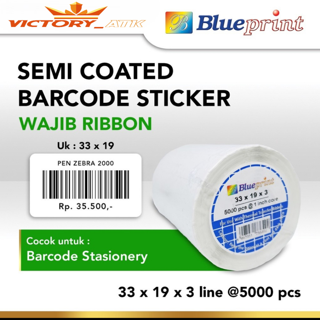 Sticker Barcode 33x19 mm 3 Line Semicoated BLUEPRINT Stiker Label 33 x 19 x 3 Core 1" isi 5000 Pcs