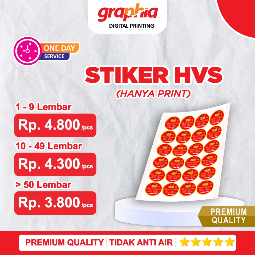 Stiker HVS Merupakan Sticker yang memiliki daya tahan rekat yang terbatas serta pada bagian lemnya juga mudah mengelupas. Kebanyakan perusahaan menggunakan stiker dari kertas HVS ini untuk souvenir, label pengiriman karna stiker ini bisa di tulis. Dan di cetak menggunakan mesin KONICA JTS
