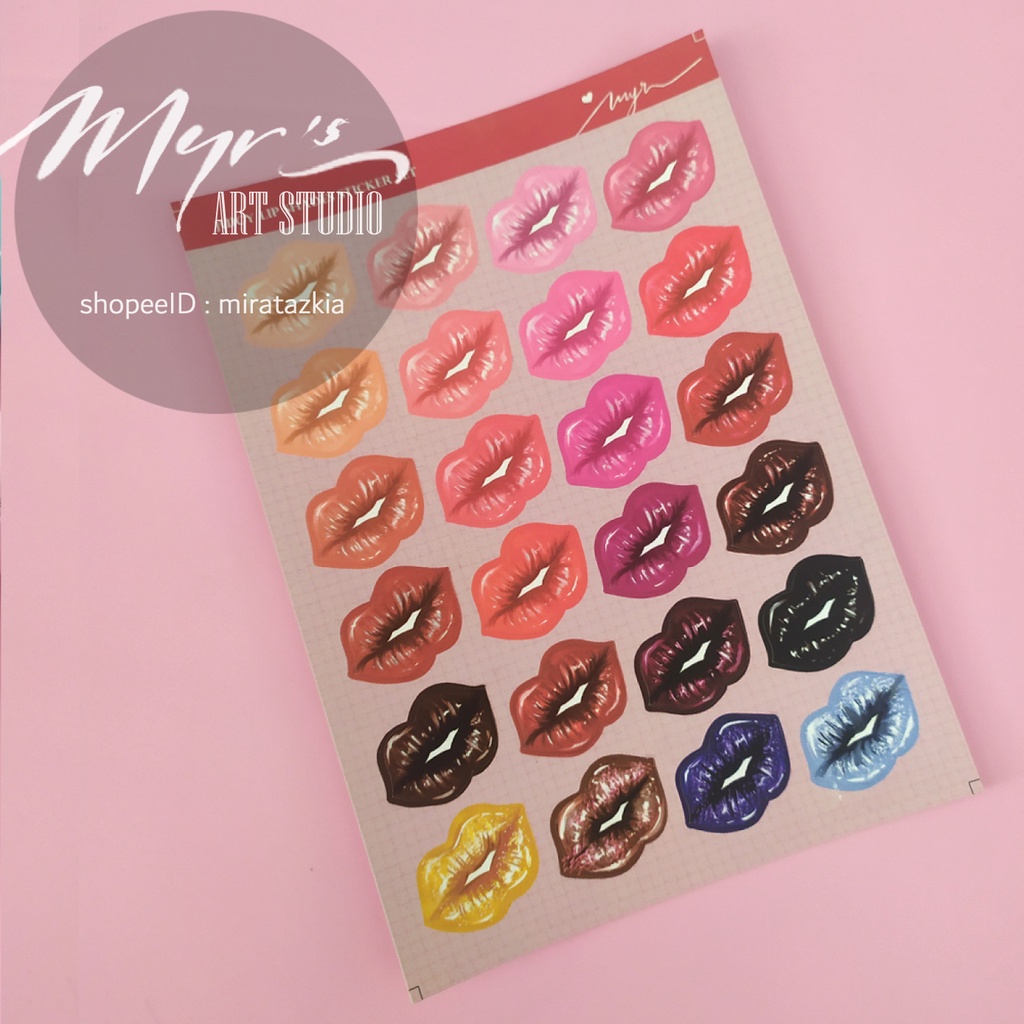 Satu set sticker vinyl laminasi doff berbentuk bibir dengan 24 warna lisptik pilihan yang bisa dipakai sesuai mood, untuk journaling, untuk fangirling, dll.