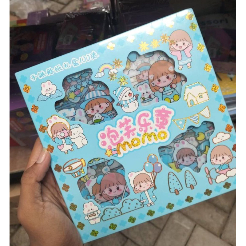 Sticker Momo tersedia kotak biru dan hijau
