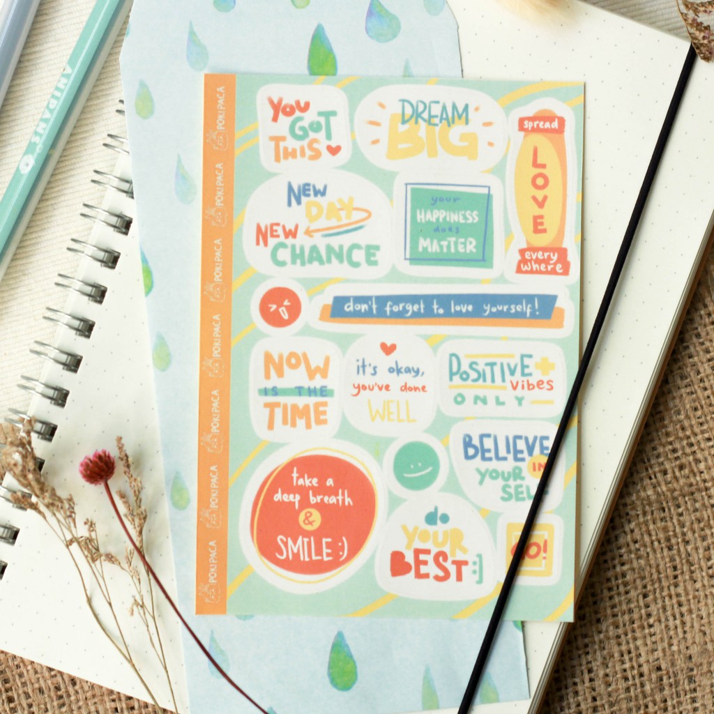 Sticker dengan ilustrasi cute aesthetic kata-kata motivasi yang cocok untuk DIY Journal, Planner, menghias cover buku, dan lain-lain karena sticker bersifat waterproof sehingga bisa ditempel dimanapun sesuai kreasi.