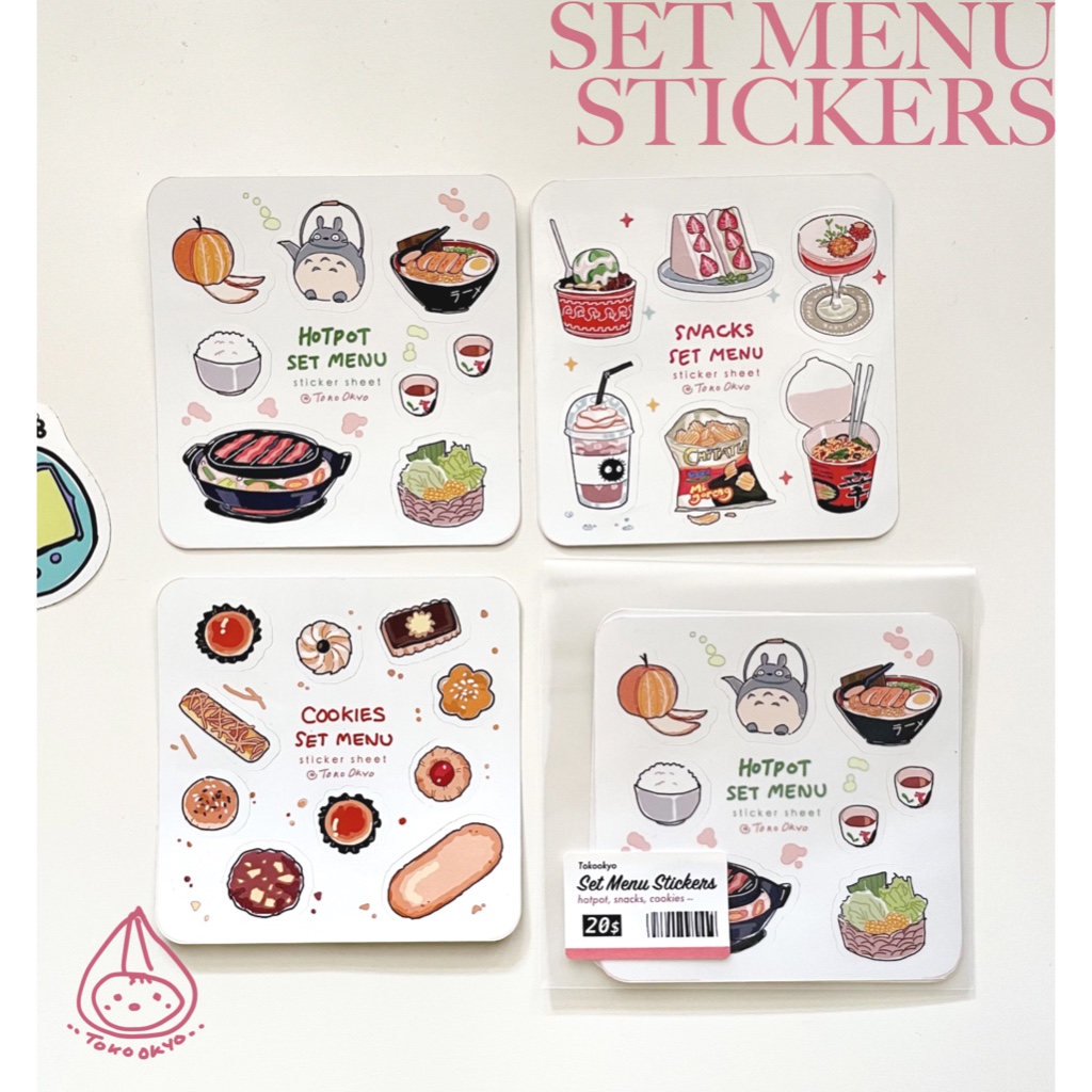 Set Sticker vinyl glossy ukuran 8cm x 8cm, berisi 3 lembar : hotpot, snacks dan cookies.