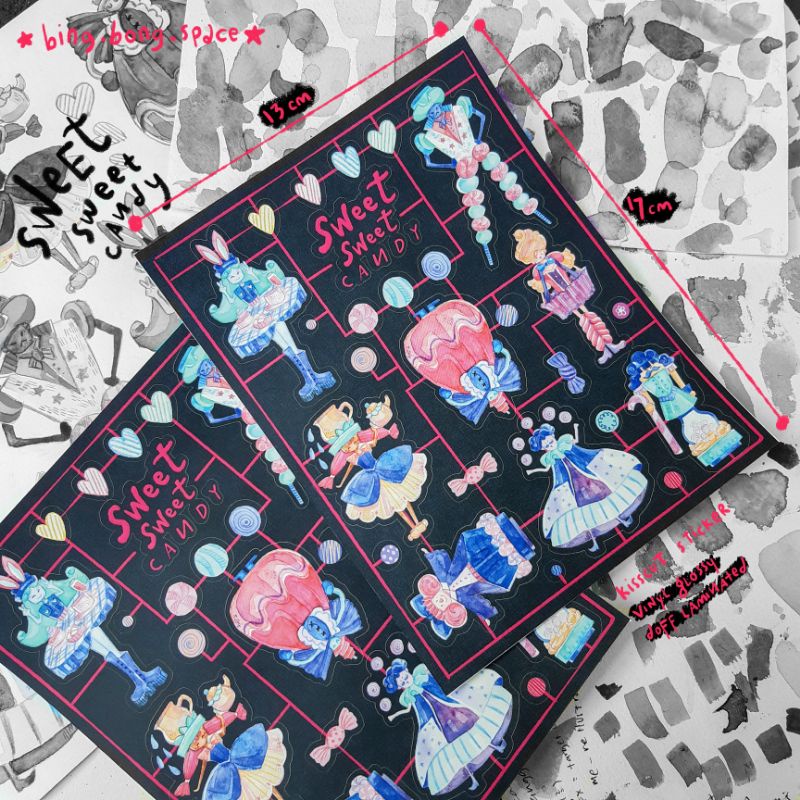 ☆ Sticker Sheet - Sweet Sweet Candy ☆ Harga : Rp30.000 KISSCUT STICKER (tinggal lepas & tempel) Ukuran : 13 × 17 cm Bahan : Vinyl Glossy & Doff Laminated Waterproof & Scrathproof sweet sweet candy for the sweetest one! warnai benda kesukaan kalian sama karakter- karakter manis ini