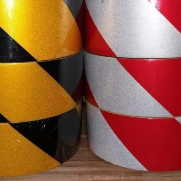 Stiker reflective baricade cina, stiker safety police line dapat memantulkan cahaya bila terkena sinar lampu.