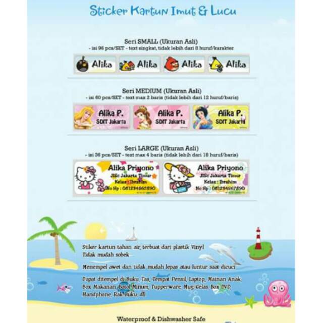 Sticker label nama dan sticker cutting, tahan air (waterproof) adalah sticker kartun imut & lucu, dengan pilihan huruf dan berbagai pilihan gambar kartun, terbuat dari plastikVinyl tidak mudah sobek.