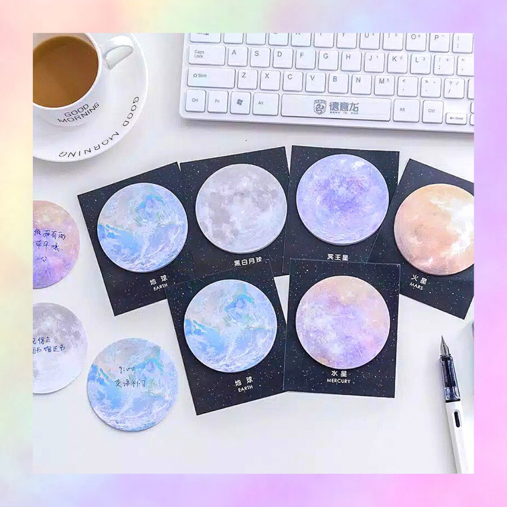 Sticky Note ini memiliki bentuk bundar dengan gradasi warna galaxy sesuai dengan nama planetnya masing-masing sehingga membuat tampilannya menjadi menarik. Sangat cocok untuk mempercantik hasil menulismu.