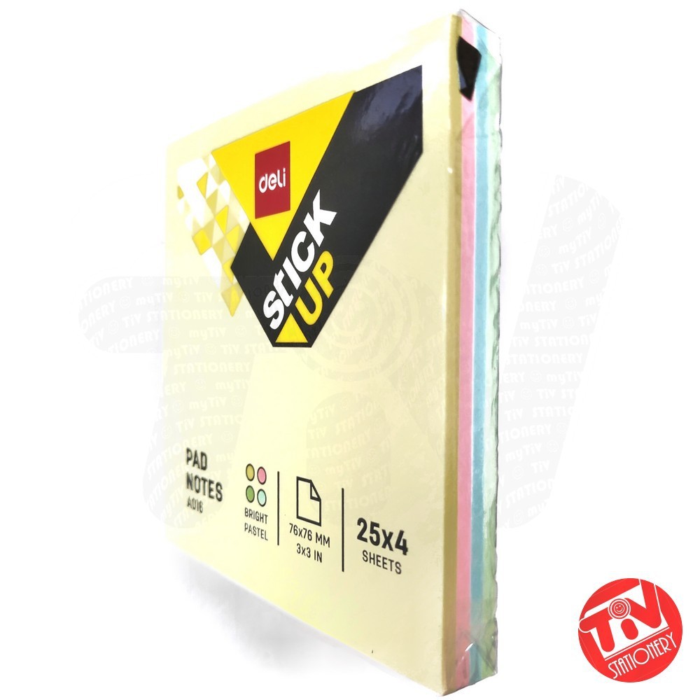 Stick Notes merek Deli dengan warna pastel yang soft ukuran standar (76x76 mm). Harga tertera merupakan harga per pack yang berisi 100 lembar dengan 4 variasi warna (masing2 warna 25 lembar)