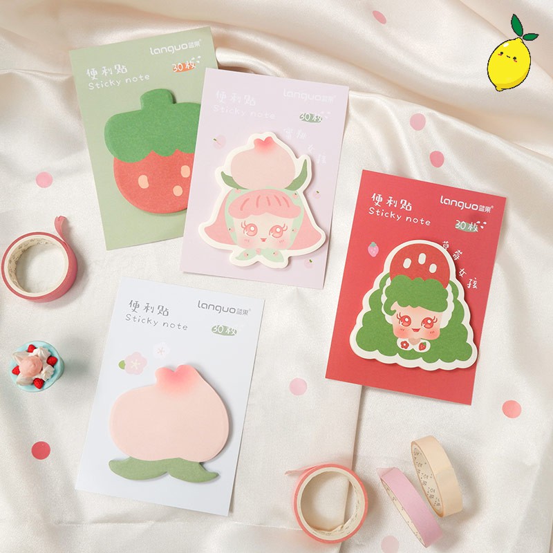 Catatan tempel (sticky notes) bertema buah stroberi dan persik ini bakal membuat semua tulisanmu terlihat berwarna dan ceria. Cocok untuk menulis reminder atau todo-list dan menempelkannya pada meja atau di dalam jurnalmu.