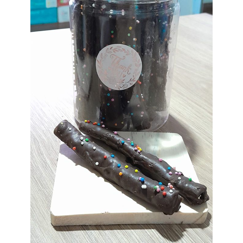 2 Stik pangsit coklat dengan toping springkle (mutiara warna warni)