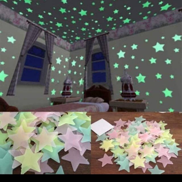 Glow In The Dark Sticker mengandung phospor, sifatnya menyerap cahaya lampu dan akan mengeluarkan pada saat ruangan gelap. Oleh sebab itu, waktu pertama kali anda tempel, disarankan lampu di ruangan tetap nyala ( agar bintang tersebut bisa menyerap cahaya dalam beberapa menit ).