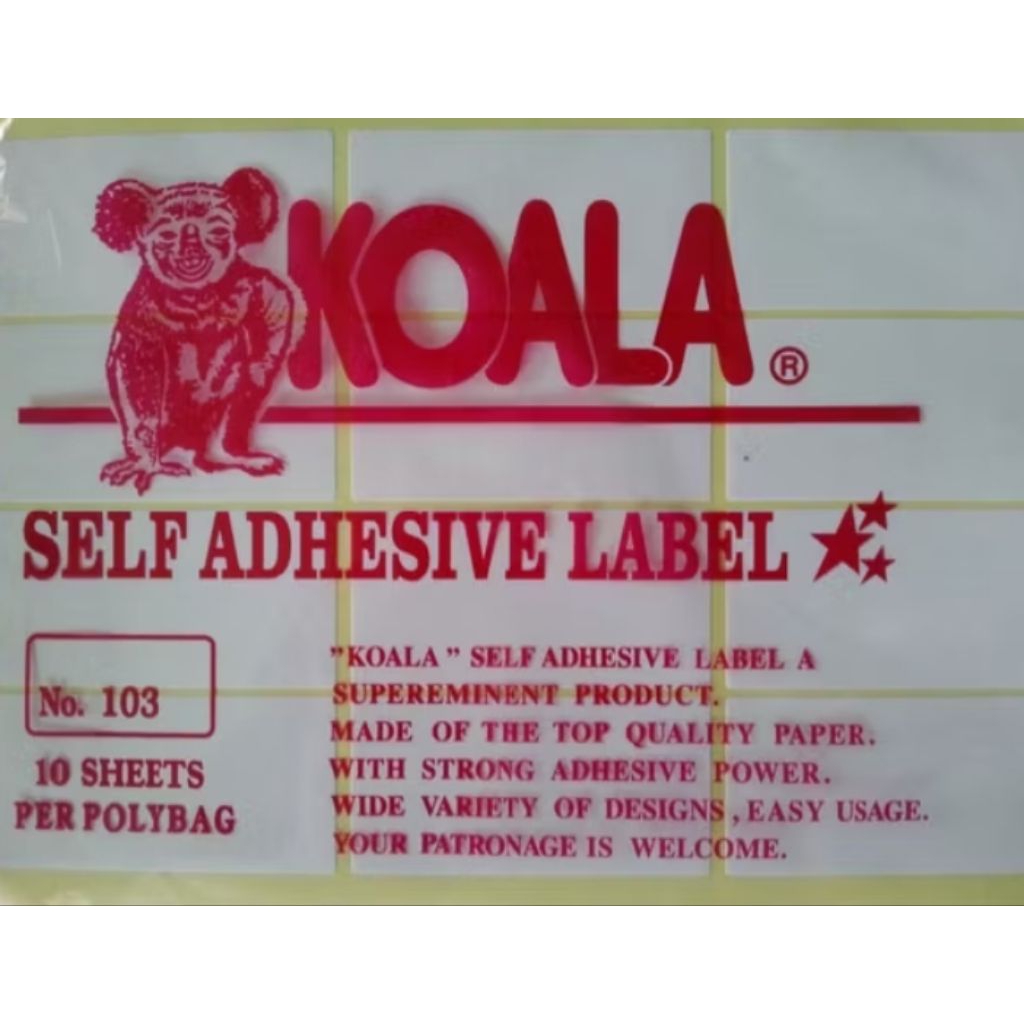 Stiker Koala 103 adalah stiker label nama dengan nomor produk 103, biasanya digunakan untuk label undangan, buku tulis, atau label harga. Stiker ini memiliki daya rekat yang kuat dan tersedia dalam kemasan 10 lembar per pack. Setiap lembar stiker berisi 12 pcs stiker dengan ukuran sekitar 6.4 x 3.2 cm.