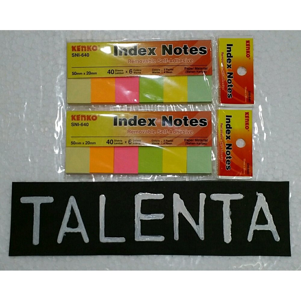 diatas perbungkus. index note isi 6 rna bahan kertas ukuran 50 mm x 20 mm. perrna isi 40 lembar catatan