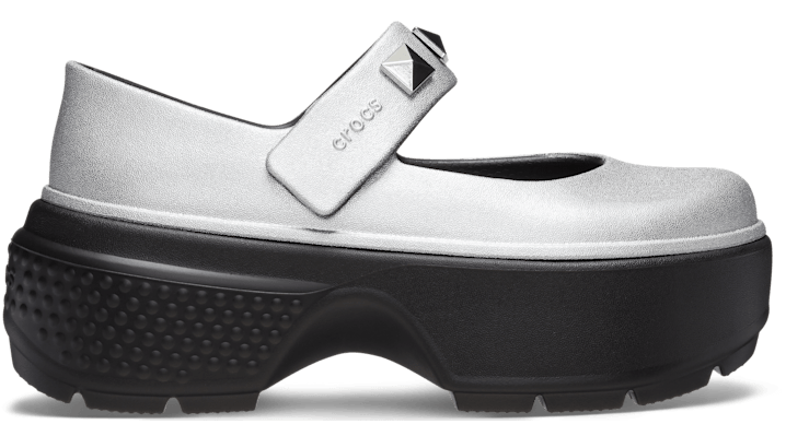 Tread heavily and let the ground know who’s boss. The Stomp Collection features stylish exaggerated soles that are excessively chunky and daring while still feeling light on your feet — and now includes a fashionable Mary Jane version. Leveraging the shape and fit of the Stomp Clog, but with a slimmer, more refined toe shape, the Stomp Mary Jane features the trend-right Mary Jane upper and an adjustable front strap with Jibbitz™ holes. This metallic version also features a shiny metallic finish and removable silver stud Jibbitz™ charms on the strap. You’ll still enjoy the exaggerated lug soles and youthful, chunky height seen across the Stomp Collection. With dramatic proportions that elevate its inherent boldness and all of the charms of personalization, the Stomp Collection lets you stomp to your own eye-catching beat. Stomp Metallic Mary Jane Details: Shiny metallic finish on Mary Jane style upper Adjustable front strap with Jibbitz™ holes Removable silver stud Jibbitz™ charms on the strap 2.3-inch | 5.9cm heel height Lightweight construction Exaggerated lug sole Molded Croslite™ upper Customizable with Jibbitz™ charms on strap Iconic Crocs Comfort™: Lightweight. Flexible. 360-degree comfort.