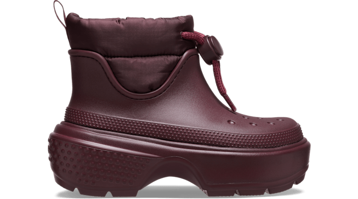 Tread heavily and let the ground know who’s boss. The Stomp Collection features stylish exaggerated soles that are excessively chunky and daring while still feeling light on your feet. With dramatic proportions that elevate its inherent boldness, the Stomp Collection lets you stomp to your own eye-catching beat. Stomp Puff Boot Details: 5.5cm / 2.1-inch heel height Lightweight construction Nylon puff upper shaft Pull tabs for easy on / off Adjustable toggle lacing Low collar height for a democratic fit Exaggerated lug sole Molded Croslite™ upper Mid-ankle collar height for a democratic fit Dual Crocs Comfort™: Blissfully supportive. Soft. Cradling comfort.