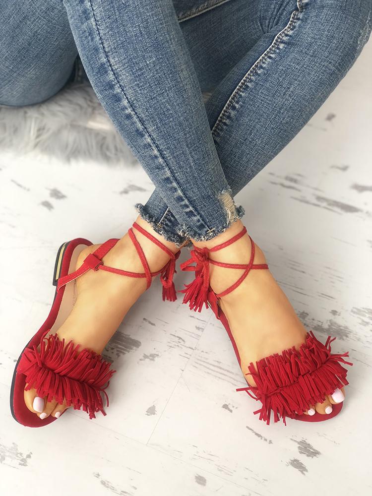 Strappy Tassel Open Toe Flat Sandals, Red