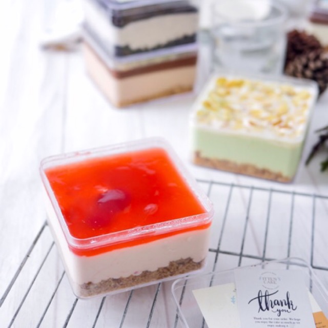 Terdapat 3 layers dalam 1 box yaitu cookies, strawberry cheesecake and strawberry sauce. Cheesecake kami dibuat dari bahan-bahan yang berkualitas dan dibuat 1 hari sebelum pengiriman.
