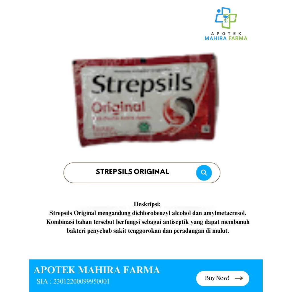 Strepsils Original mengandung dichlorobenzyl alcohol dan amylmetacresol. Kombinasi bahan tersebut berfungsi sebagai antiseptik yang dapat membunuh bakteri penyebab sakit tenggorokan dan peradangan di mulut.