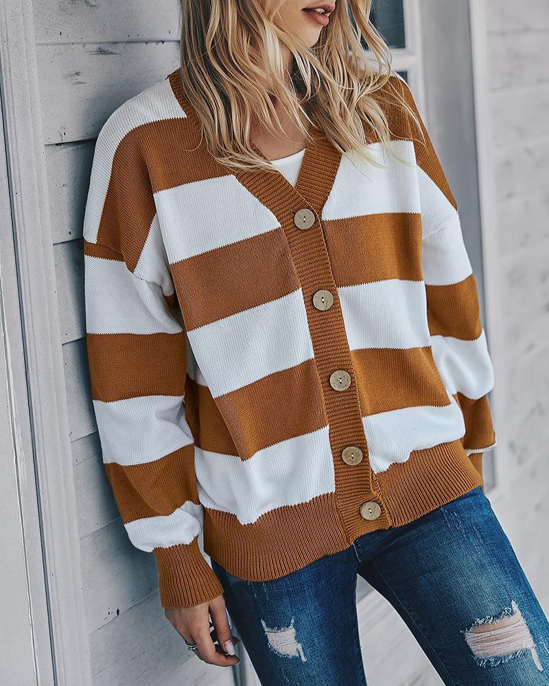 Striped Colorblock Button Design Knit Cardigan, Brown