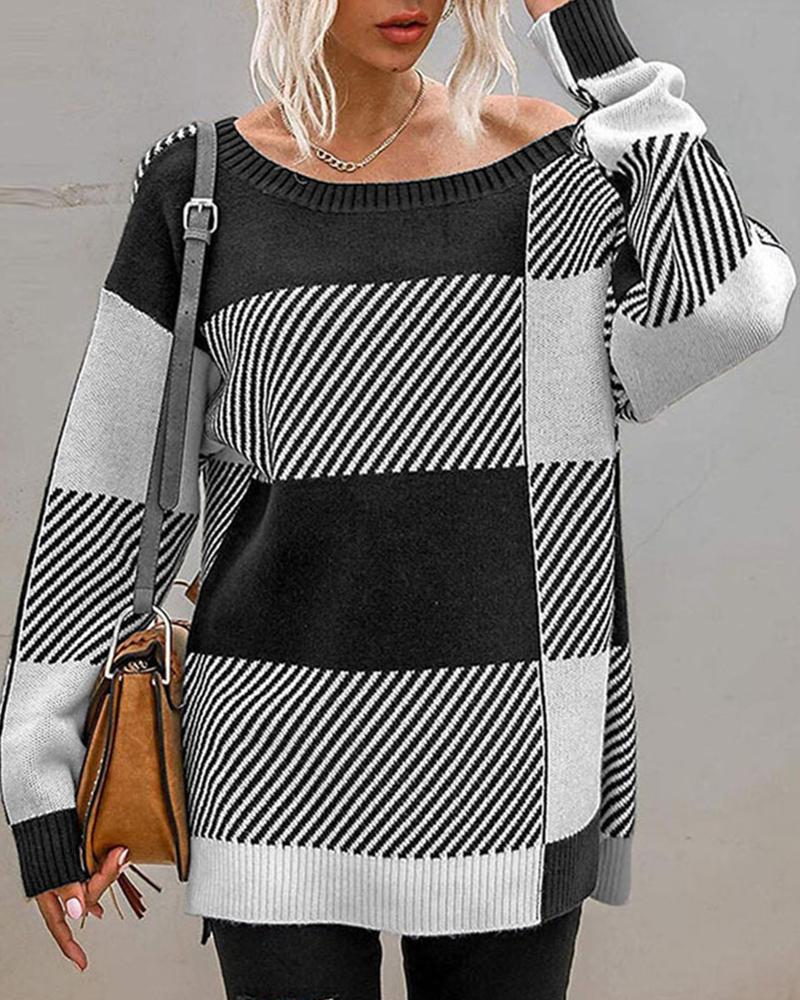 Striped Colorblock Slit Long Sleeve Sweater, Beige