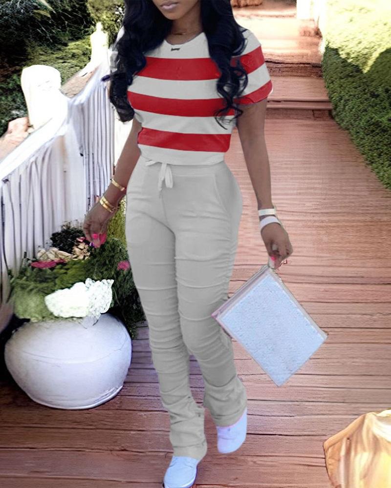 Striped Colorblock Top & Drawstring Ruched Pants Set, Gray