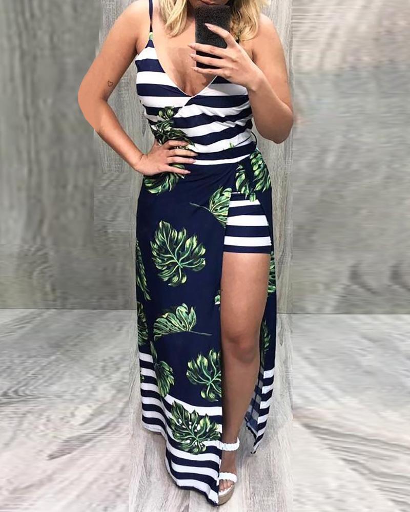 Striped Leaf Print Insert Culotte Design Romper, Purplish blue