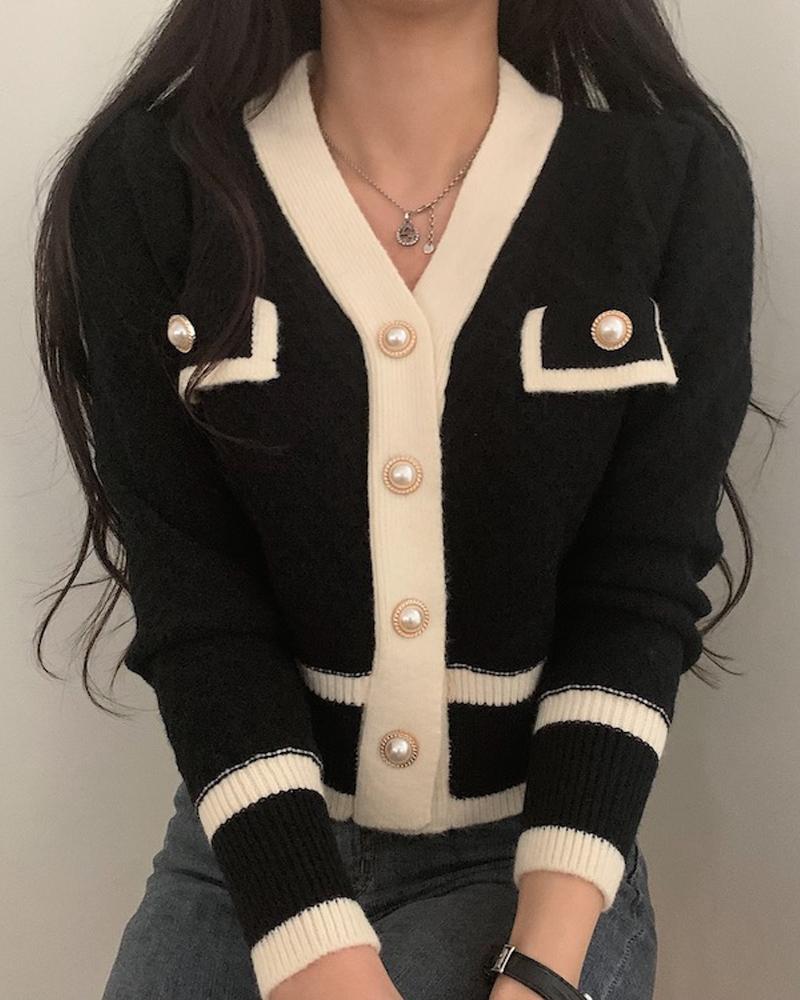 Striped Long Sleeve Buttoned Tweed Cardigan, Black