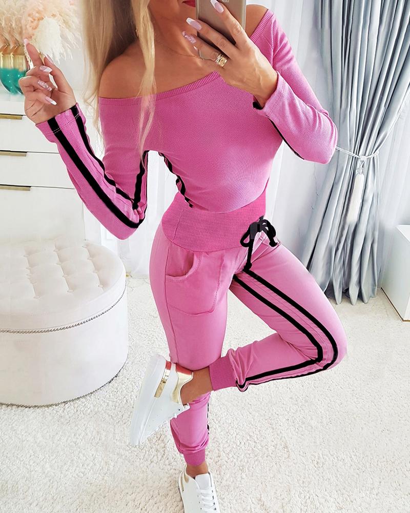 Striped Off Shoulder Top & Drawstring Pants Set, Pink