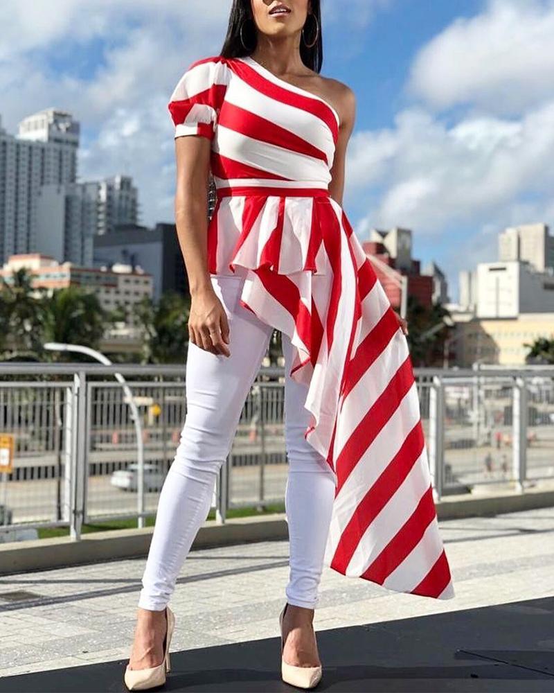 Striped One Shoulder Ruffles Irregular Blouse, Red