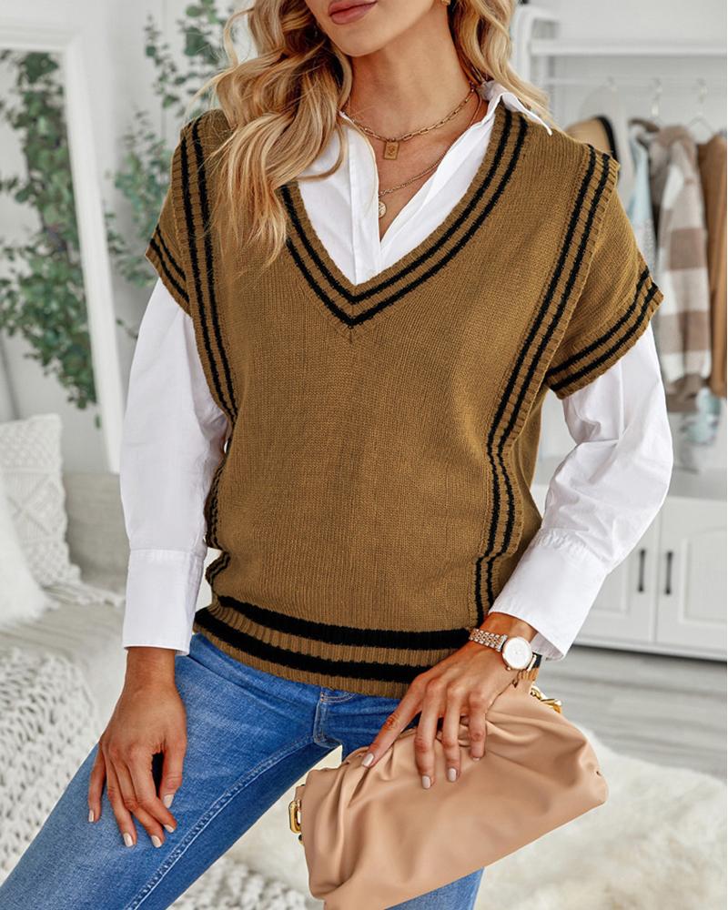 Striped Pattern V-Neck Short Sleeve Sweater, Brown