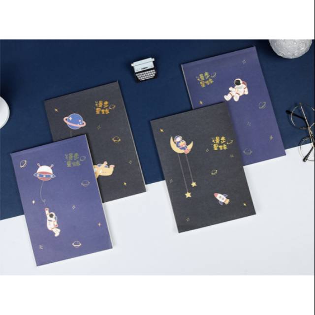 Buku tulis putih polos bernuansa luar angkasa dengan ilustrasi astronot dan planet di atas latar hitam dan biru navy. Buku ini cocok untuk dijadikan buku sketsa maupun catatan. Dijilid lem dengan bukaan ke atas.