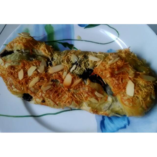 Cake dengan pastry yang renyah, dengan tab uran keju diatas. Isi pisang dengan tambahan coklat dan keju