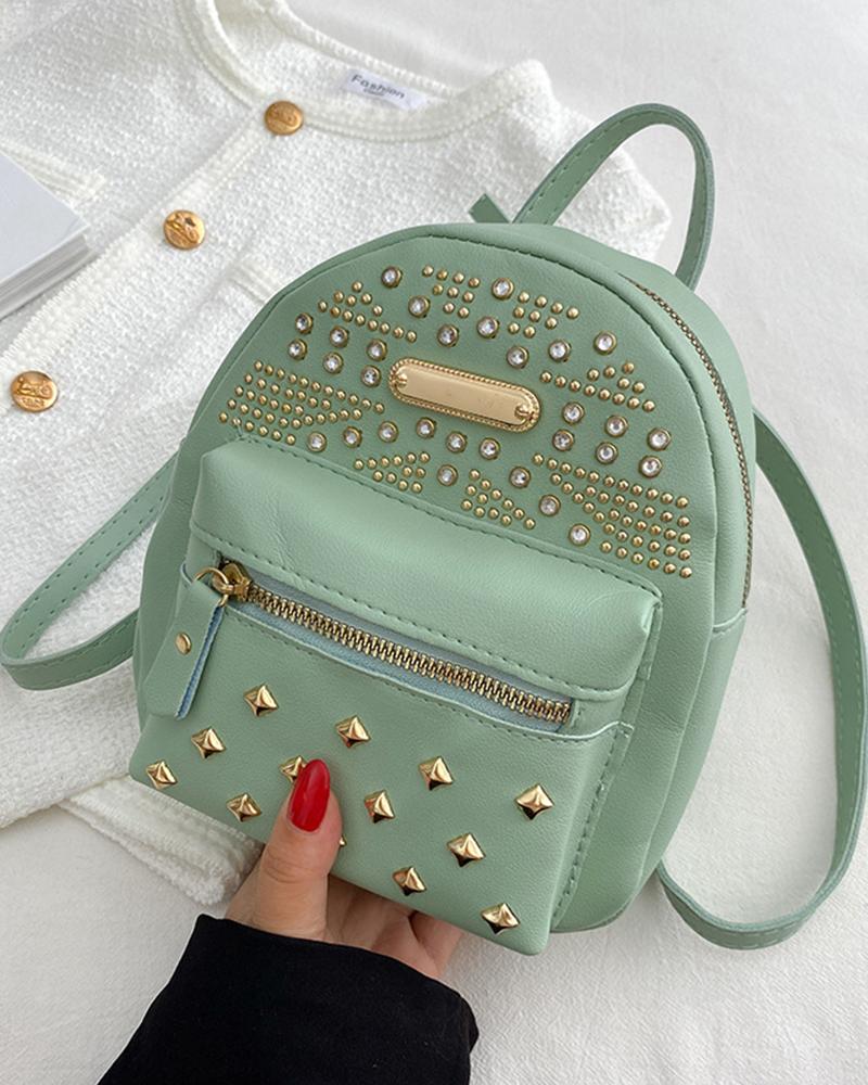 Studded Rhinestone Decor Zipper Design Backpack Trendy School Bag, Green