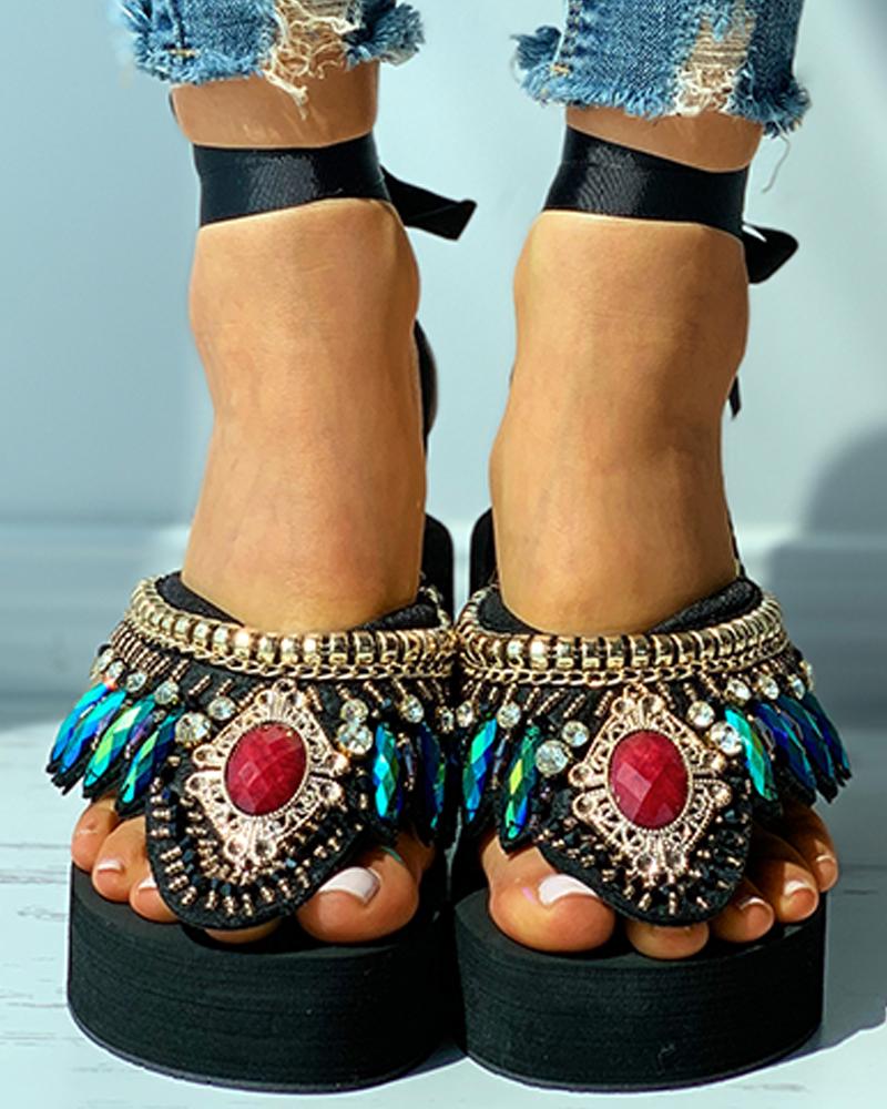 Studded Rhinestone Toe Post Wedge Sandals, Black