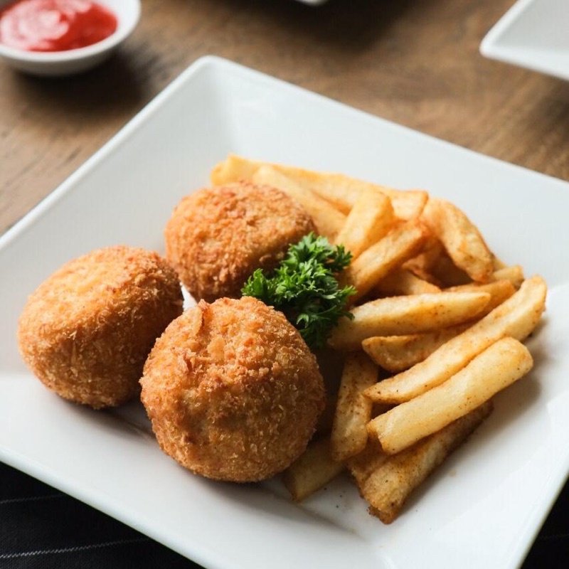 Daging ayam giling dengan isian keju mozarella meleleh + kentang goreng