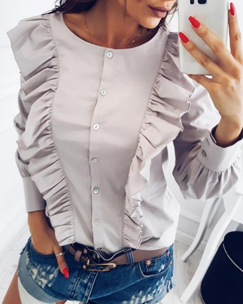 Stylish Ruffled Button Patchwork Blouse, Gray
