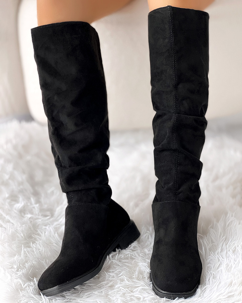 Suede Ruched Chunky Heel Boots, Black