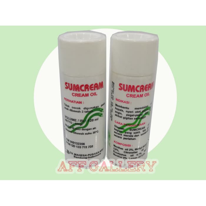 Sumcream Sumbawa Cream Oil produksi CV. Mahesa Pusaka Asli Bandung Indonesia. Sumcream Sumbawa memiliki fungsi yang beragam atau MULTIFUNGSI. Karena Suncream Sumbawa merupakan penggabungan dari beberapaproduk diantaranya: Balsem, Minyak Aromatherapy, Minyak Angin, Minyak Pijat, Cream Pijat, Obat Gosok, Obat Luar, Salep, dan Inhaler. Maka secara garis besar berfungsi sebagai: