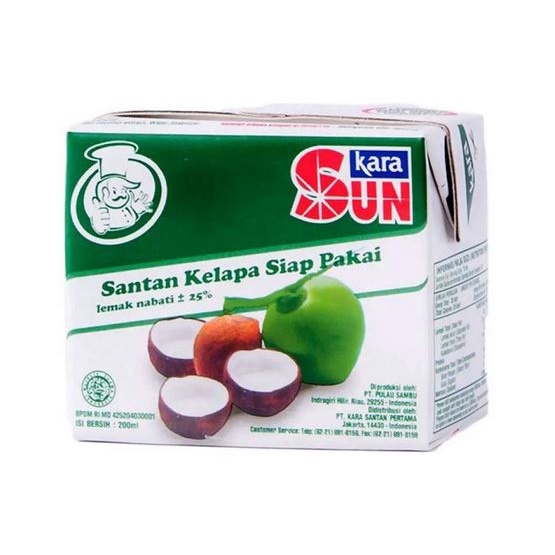 Sun Kara merupakan santan kelapa siap pakai yang terbuat dari air kelapa yang dikukur Santan Kara Sun diolah dan dikemas secara modern dan higienis menggunakan sterilisasi tinggi UHT sehingga kesegaran dan keaslian santan terjaga dengan baik serta membuatnya tahan disimpan dalam waktu lama di dalam kulkas.