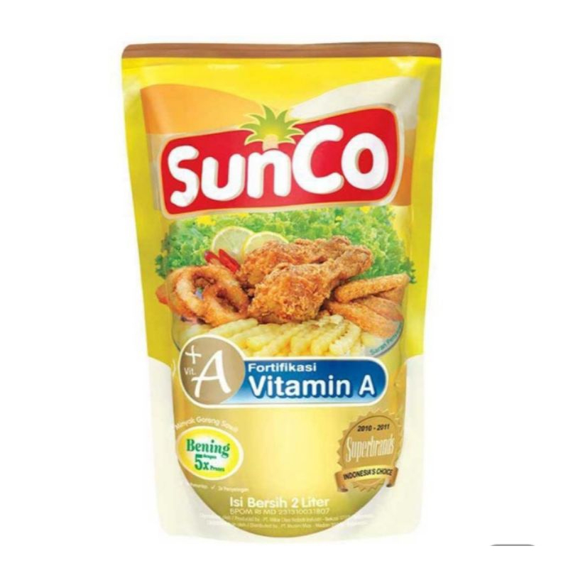 SunCo Minyak Goreng 2 L adalah minyak goreng masak yang diproduksi dari buah kelapa sawit segar pilihan dan difortifikasi dengan vitamin A. Diproses dengan teknologi mutakhir melalui 5 tahap pemrosesan, yakni 3 kali proses pemurnian dan 2 kali proses penyaringan sehingga menghasilkan minyak goreng yang baik dan berkualitas. Adapun ciri minyak goreng yang baik adalah warna minyak yang bening, tidak mudah beku, dan karakternya seperti air. Warna Sunco yang bening dan tidak cepat hitam atau teroksidasi dapat meminimalkan risiko kanker. Berbeda dengan minyak goreng sawit lain, Sunco tidak mudah beku karena mengandung asam lemak jenuh terendah yang dapat meminimalkan peningkatan kolesterol jahat. Tak hanya itu karakter Sunco yang seperti air, tidak lekat, dan tidak menyerap berlebih di makanan, membuat kegiatan makan lebih nyaman tanpa rasa gatal di tenggorokan.