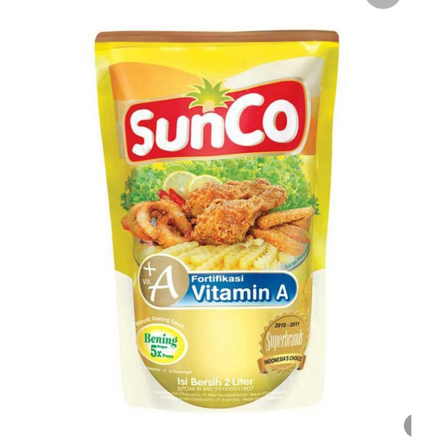 SunCo Minyak Goreng 2 L adalah minyak goreng masak yang diproduksi dari buah kelapa sawit segar pilihan dan difortifikasi dengan vitamin A. Diproses dengan teknologi mutakhir melalui 5 tahap pemrosesan, yakni 3 kali proses pemurnian dan 2 kali proses penyaringan sehingga menghasilkan minyak goreng yang baik dan berkualitas. Adapun ciri minyak goreng yang baik adalah warna minyak yang bening, tidak mudah beku, dan karakternya seperti air. Warna Sunco yang bening dan tidak cepat hitam atau teroksidasi dapat meminimalkan risiko kanker. Berbeda dengan minyak goreng sawit lain, Sunco tidak mudah beku karena mengandung asam lemak jenuh terendah yang dapat meminimalkan peningkatan kolesterol jahat. Tak hanya itu karakter Sunco yang seperti air, tidak lekat, dan tidak menyerap berlebih di makanan, membuat kegiatan makan lebih nyaman tanpa rasa gatal di tenggorokan.