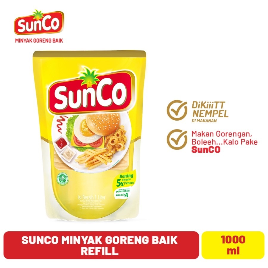 Sunco Refill 1L Diproduksi dari buah kelapa sawit segar pilihan dan difortifikasi Vitamin A.
